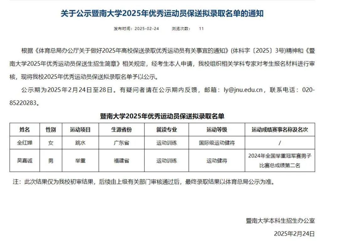 2月24日,暨南大学本科生招生办公室发布了《关于公示暨南大学2025年优秀运动员保送拟录取名单的通知》,全红婵在保送拟录取名单上,值得一提的是,全红婵的师兄谢思埸、陈艾森都是暨大校友。